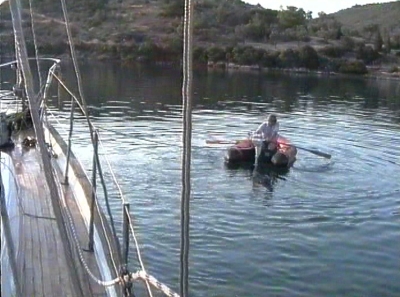 ankernden deutschen Bootes "Tramp III" an, uns bis Patras in Schlepp zu